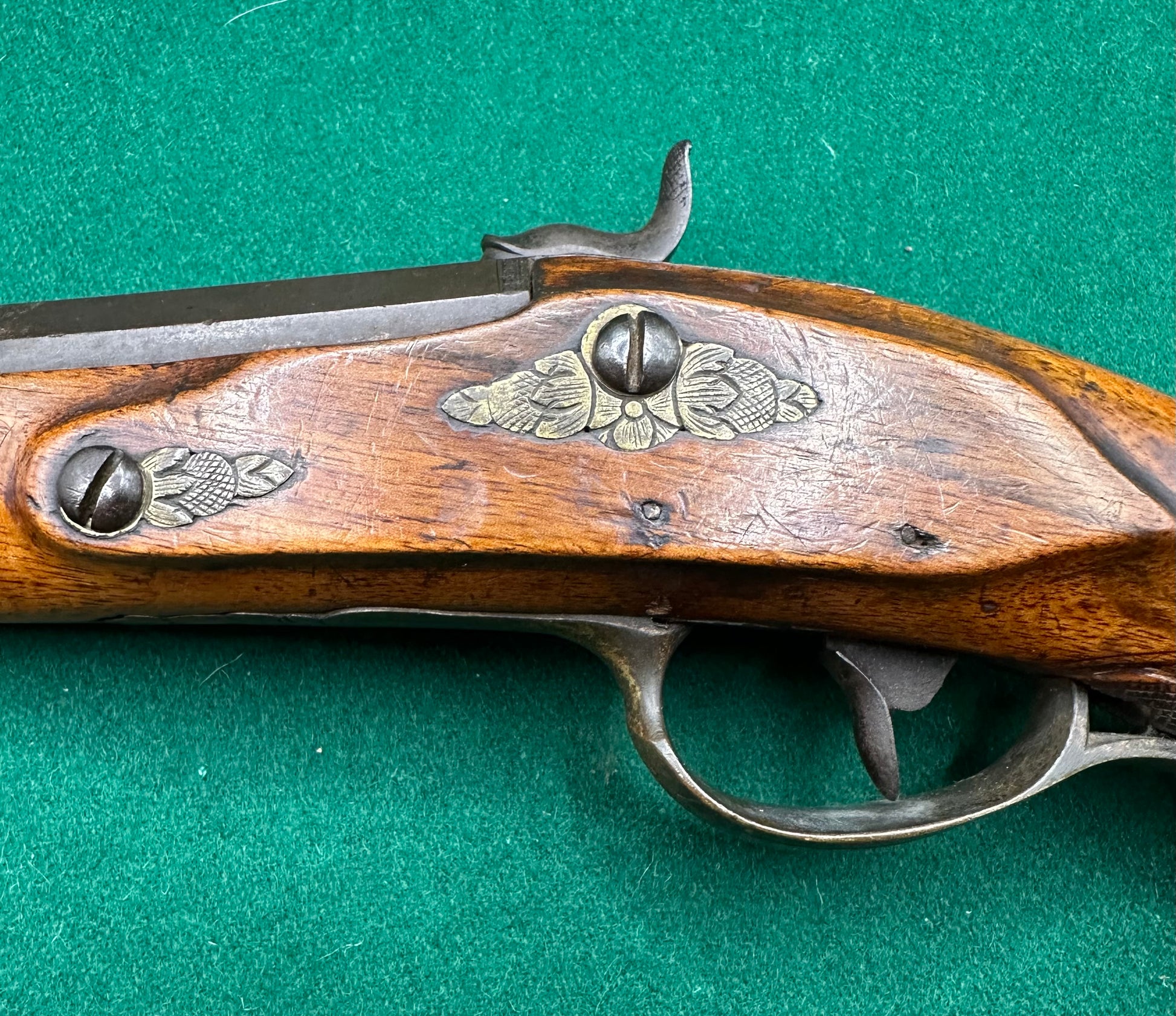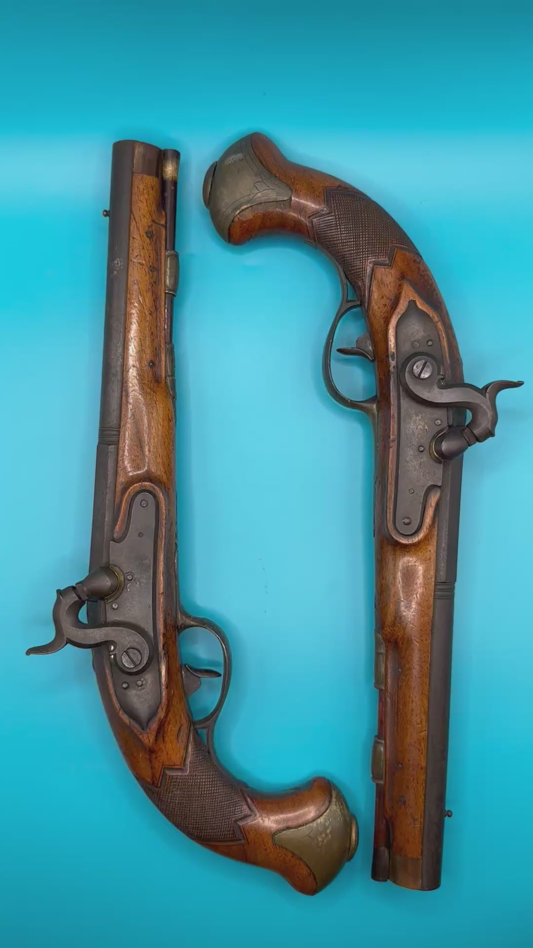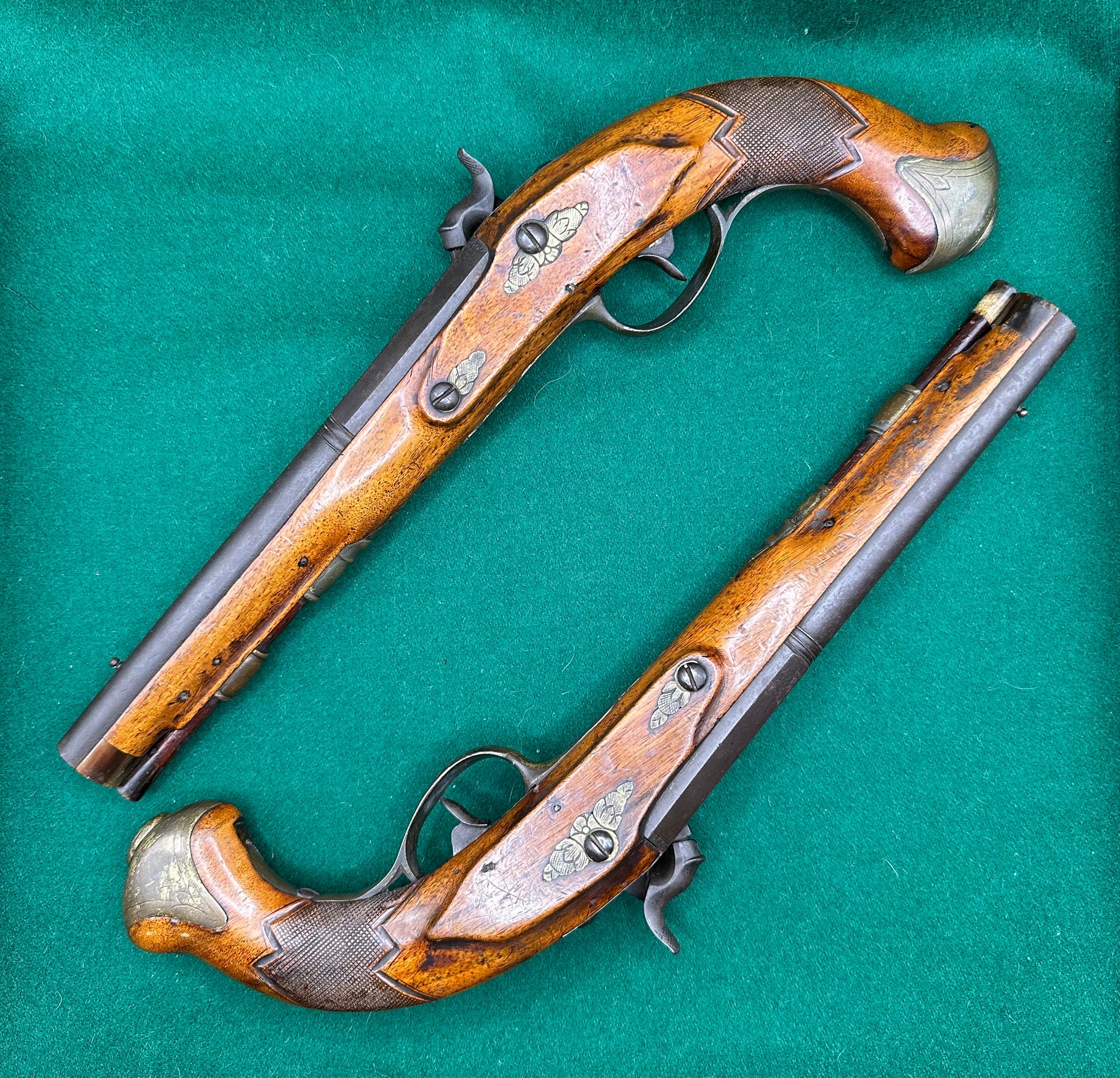 The style of these pieces are most definitely Continental, but without removing the locks or barrels for further markings I cannot be sure of the Country of origin, and that is something that I am reluctant to do given how original they look and feel.