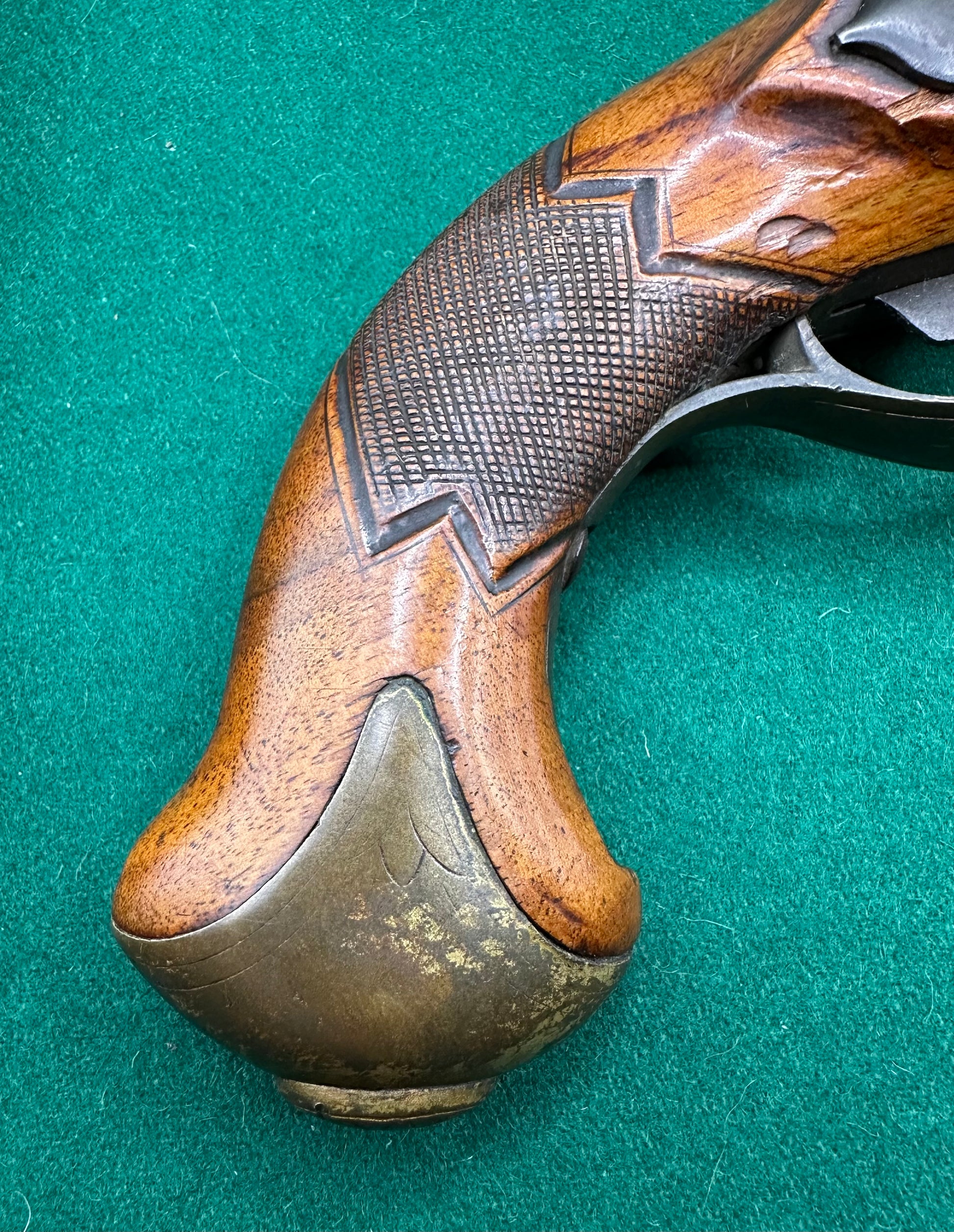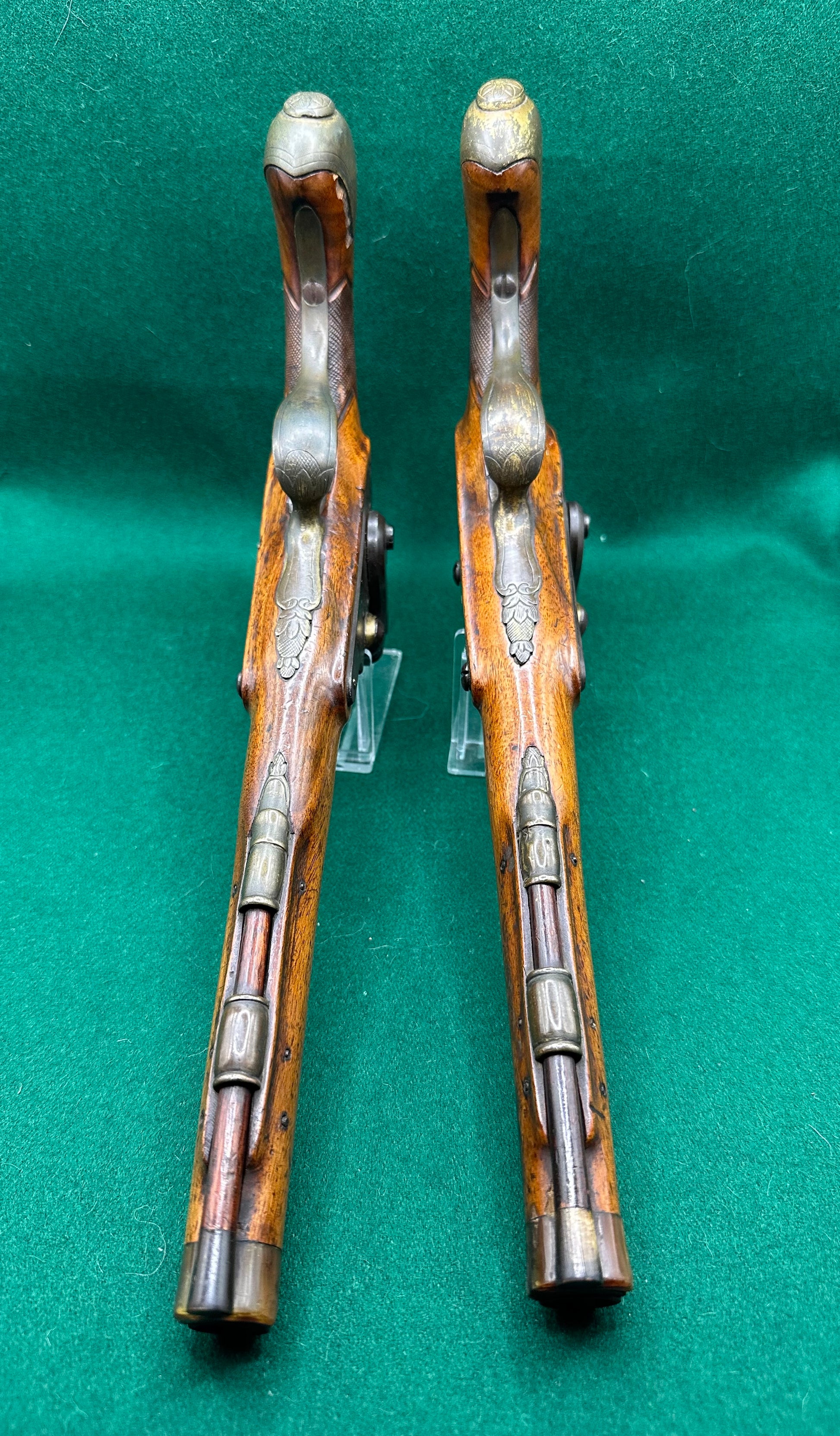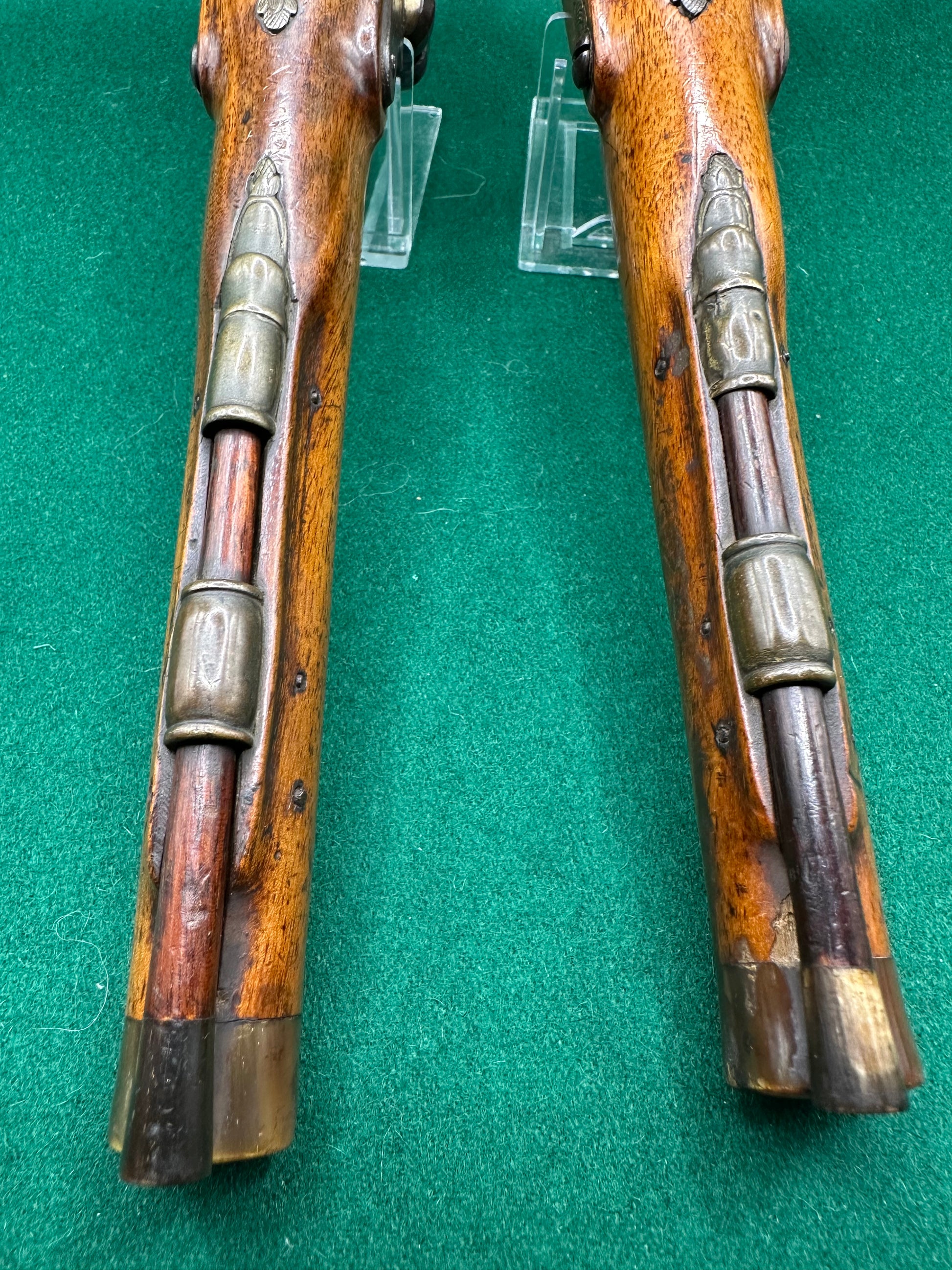 The stocks are also in good condition with a few bruises evident, however, there is a bit of damage around the brass buttcap of one of the pistols (see photos) and there are a couple of tiny splits around one of the locks.