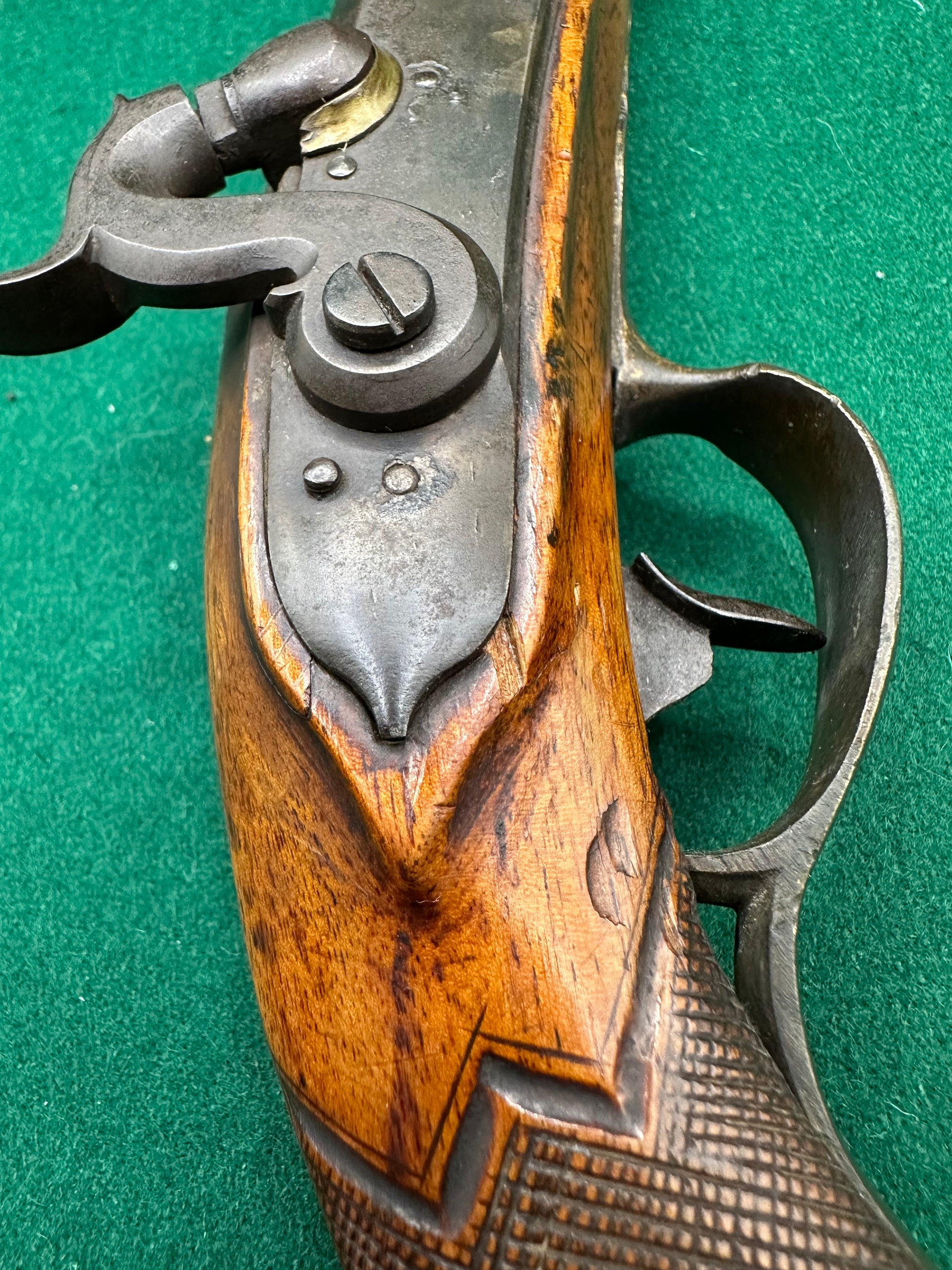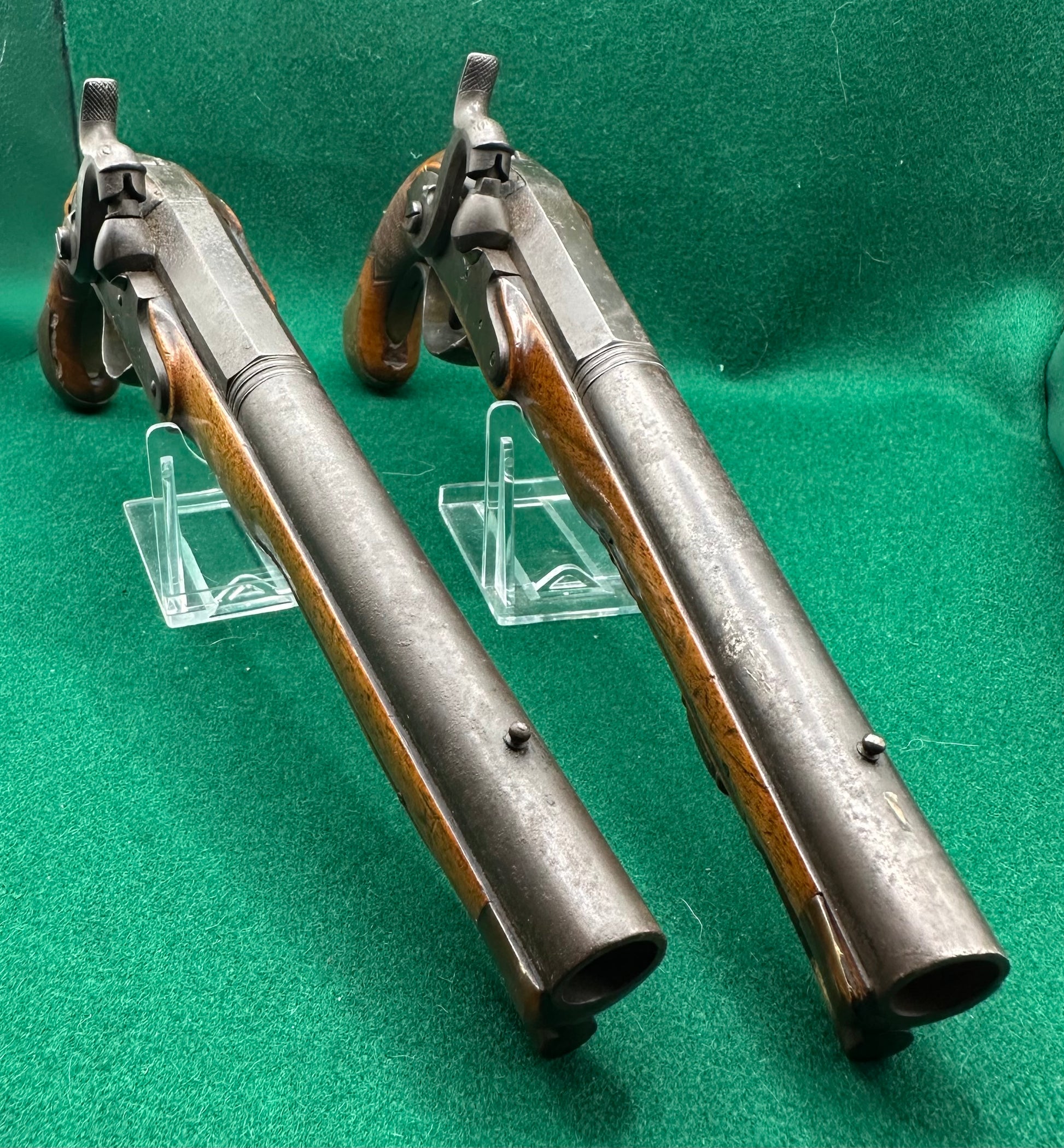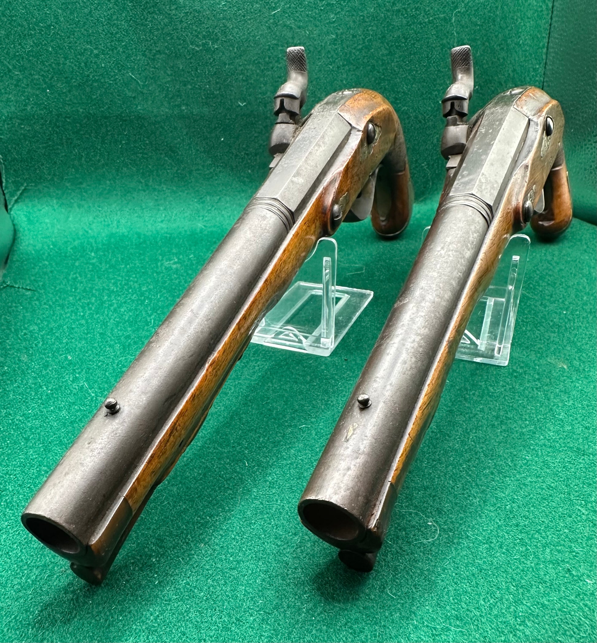 The locks are completely free of any decoration and are not signed, but the mainsprings are good and on both pistols the actions are smooth in both half and full position, although I get the impression that they have been left unused and unloved for some time.