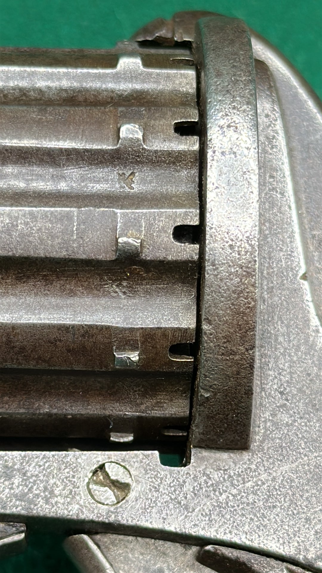 Made for the English market, there are Birmingham Proof Marks stamped between each chamber and although struck off centre it is possible to make out the makers name J. Chaineux with some lettering after that, which I cannot make out.