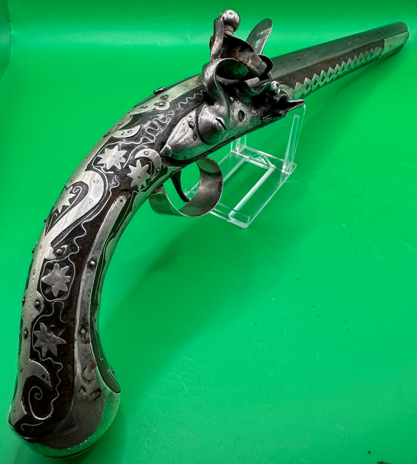 A stunning long barreled pistol profusely inland with silver (white metal) decorative panels including forend cap, trigger guard, sideplate and buttcap.