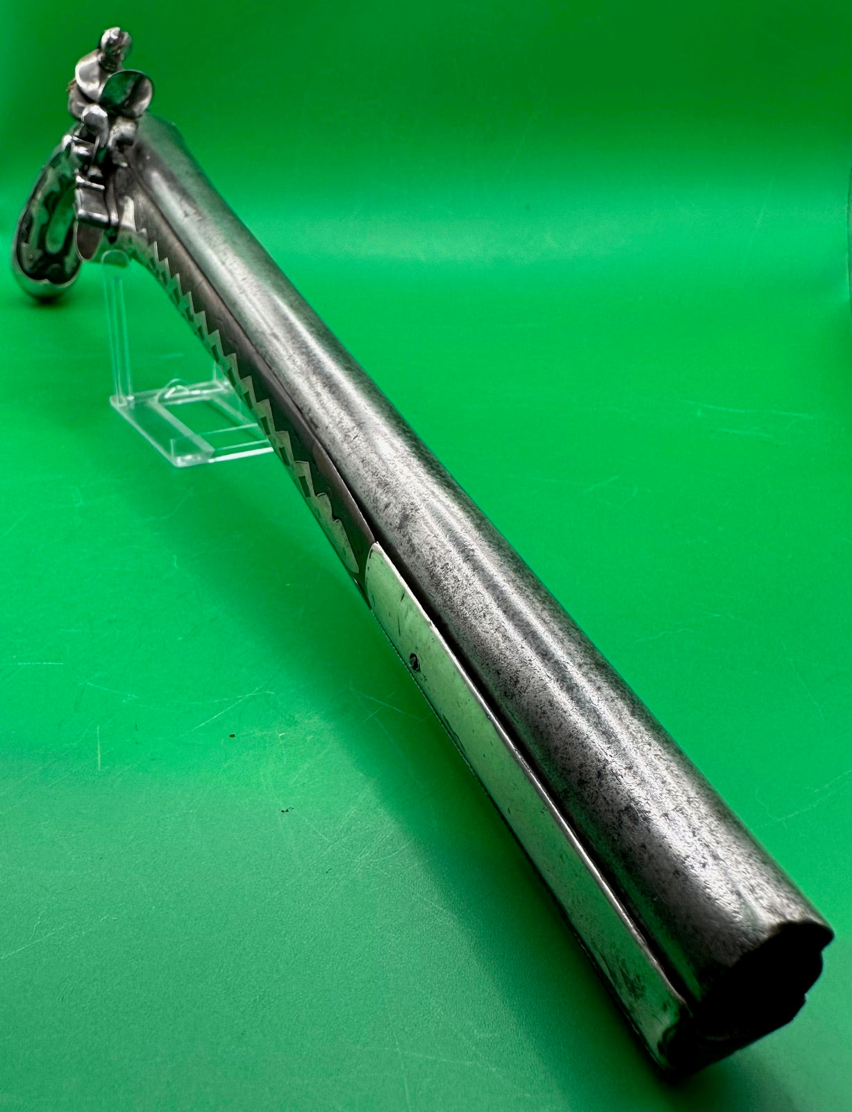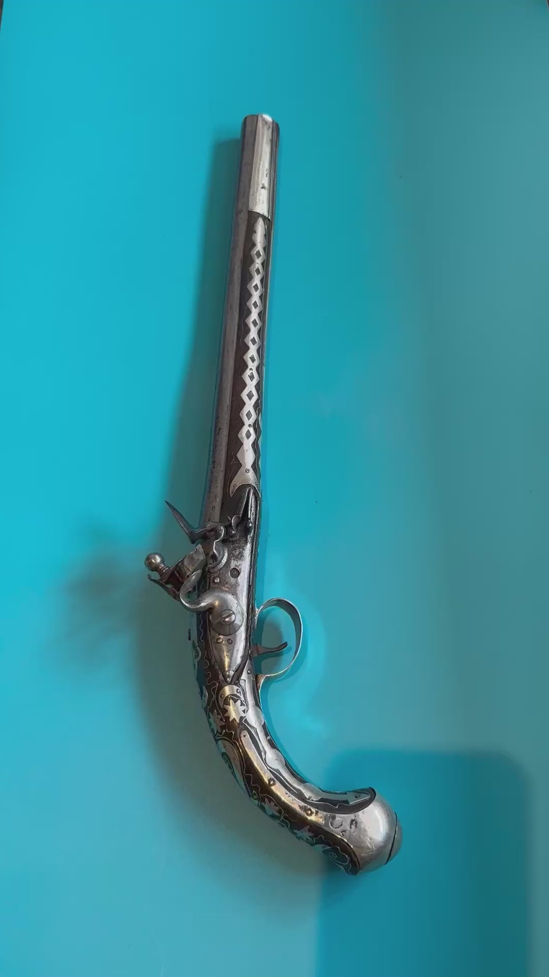 This antique pistol is considered obsolete and non functioning, and is sold as a collectable ornamental item. This product is available for purchase in the UK without a license