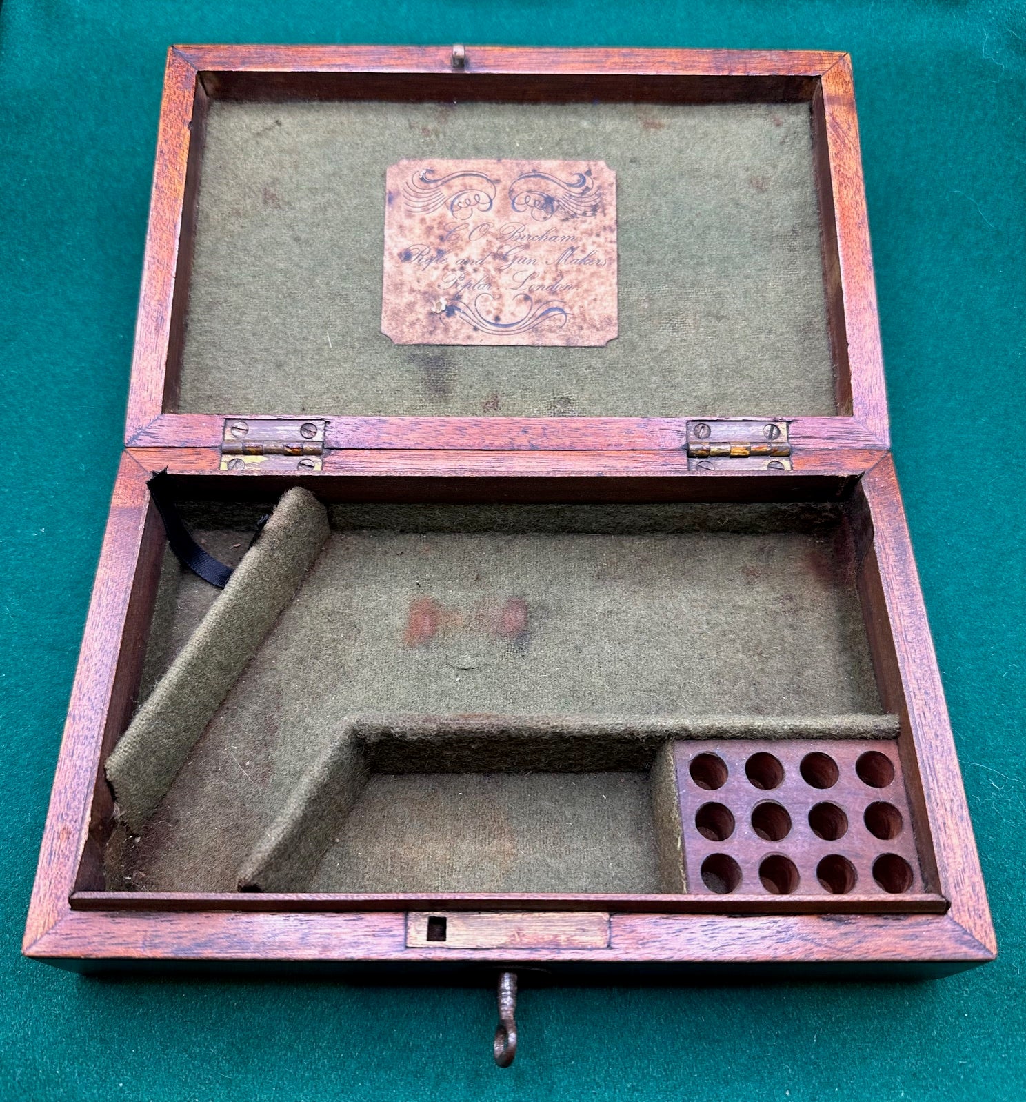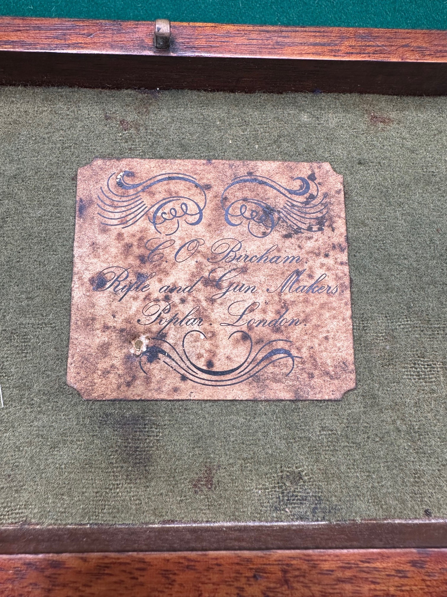 The inside of the lid of the case carries the trade label (which looks original) for C O Bircham, Rifle and Gunmakers, Poplar, London.