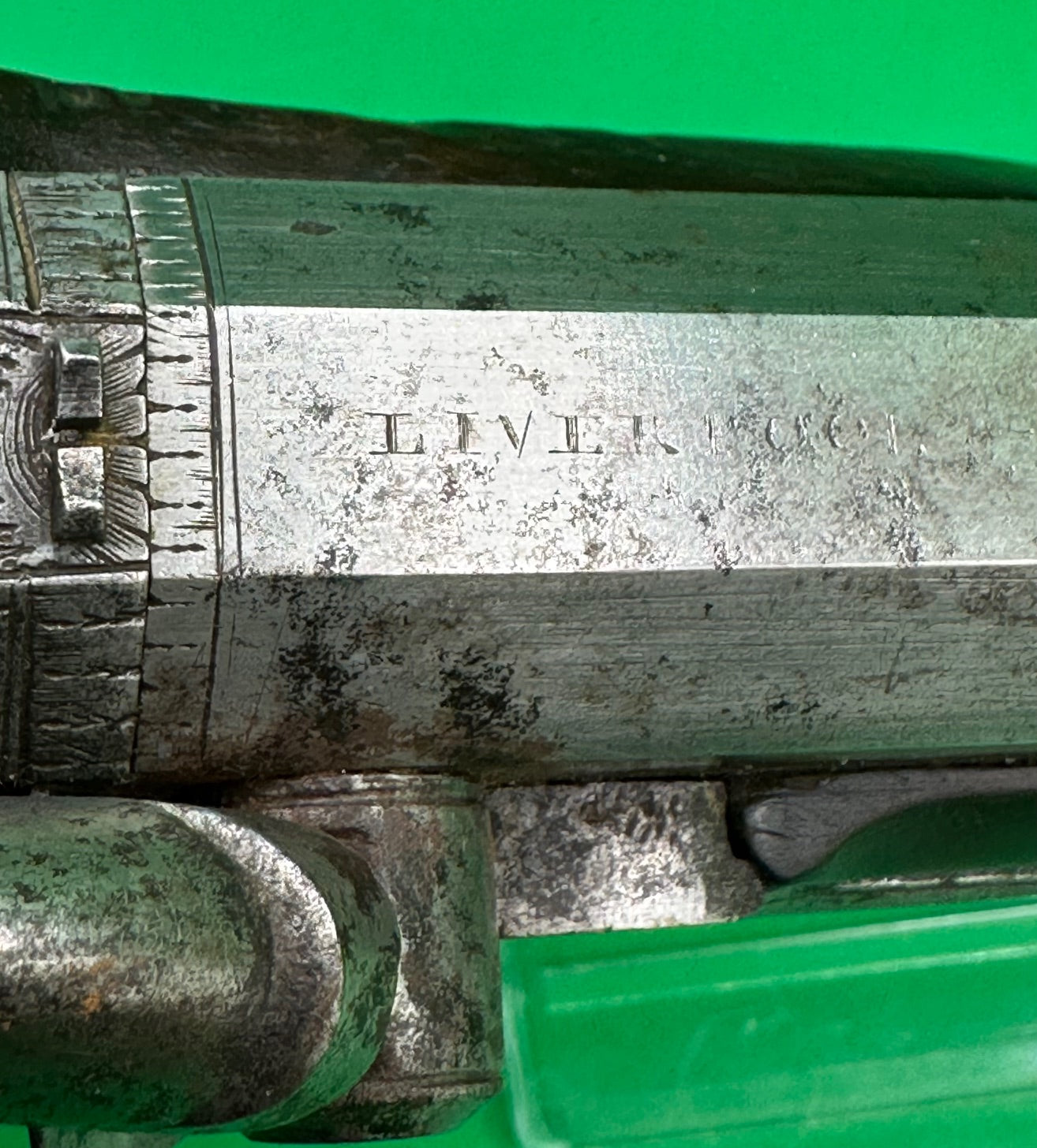 The lock is signed Patrick and the top flat of the octagonal barrel is engraved Liverpool, and in the mid 19th Century also stamped with an Irish Registration Mark.