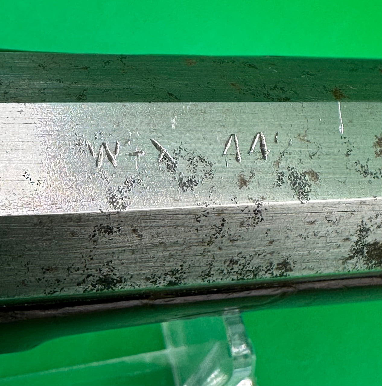 The top of the barrel has been rubbed so that the writing is faint. The registration mark is W-? 44??, the W- would indicate one of the following locations, Westmeath, Wexford or Waterford Borough.
