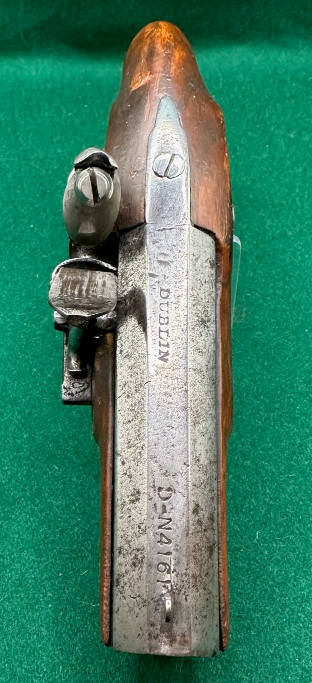The 8.5 cm octagonal barrel has a blade foresight and the top flat is stamped Dublin and D-N 4161 which is the Irish licencing registration number, which was brought in after the Irish Registration Act of 1843 (it didn't last long and stopped in 1846). D-N is the County or Borough prefix and in this case is for Down, followed by a 3 or 4 digit number.