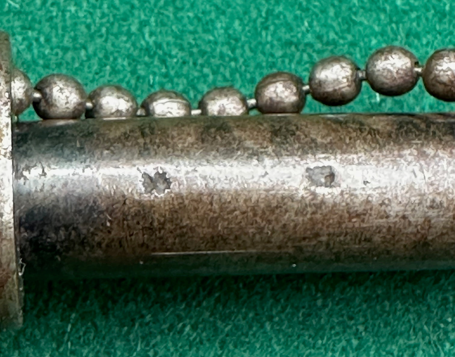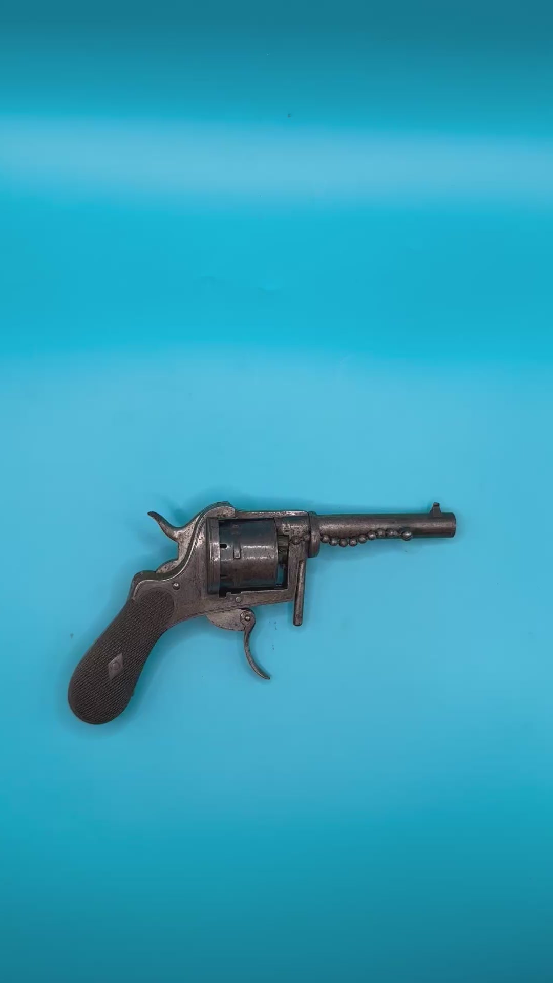 A very interesting, and not often seen Fagnus patent pocket pinfire revolver with its characteristic "bath plug" chain cylinder retainer attachment and cylinder removal mechanics.