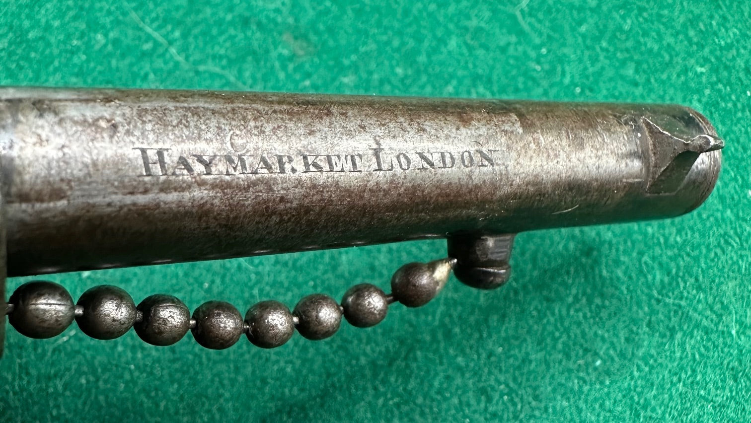 The barrel and cylinder are stamped with Birmingham Proof Marks and the decoration is a recognisable austere English double line that goes around the frame.