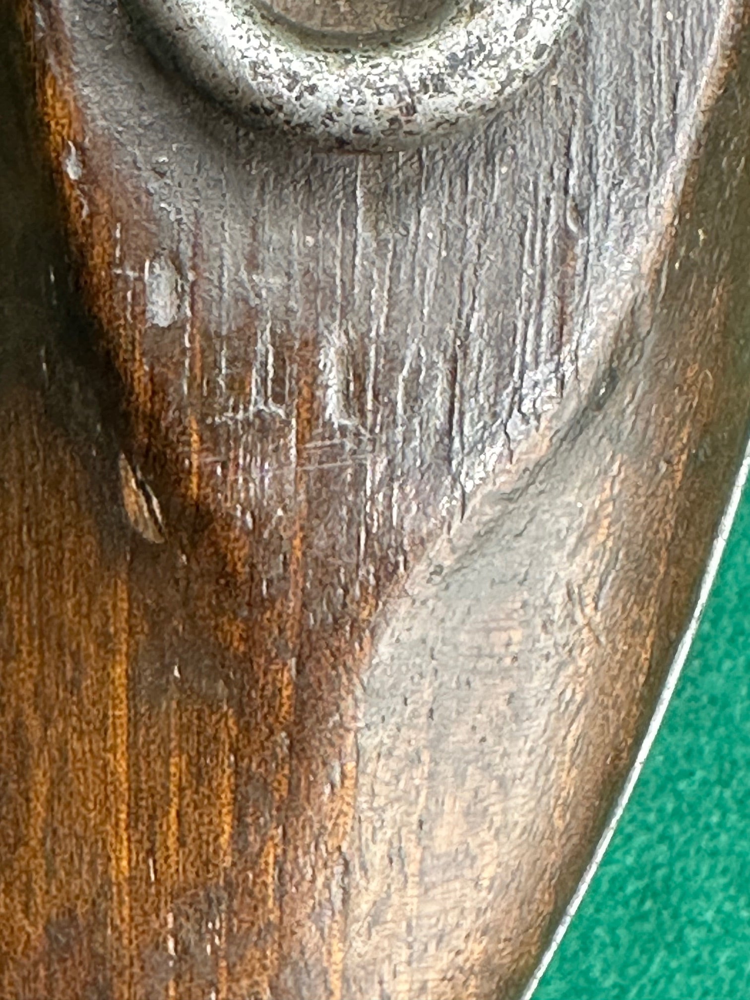 Behind the belt hook, faintly stamped is the number 110. I can see no further stamps in the wood.