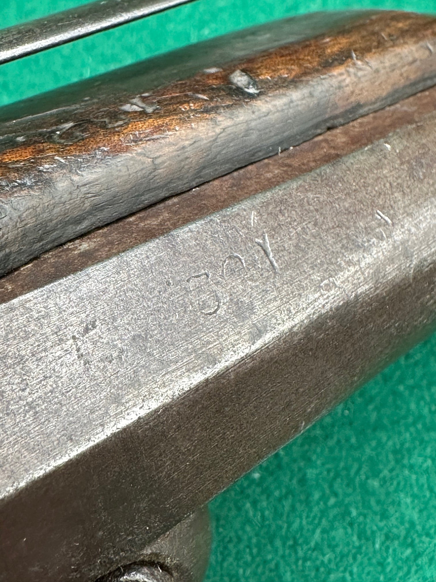 There is a faint stamp on the barrel, which I think is 32 and it looks as though this number is also stamped into the stock above the belt hook, next to the octagonal section of the barrel.